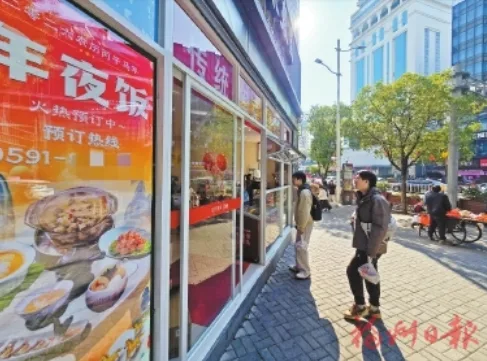 部分餐饮企业已张贴出年夜饭预定广告。福州日报记者 池远摄