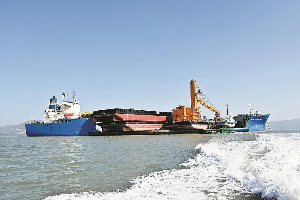 日前,从宁德港离开的巴拿马籍大型半潜船“发展之路”轮,载着5艘价值约1亿元的工程类船舶行驶在海面上。(余汕康 摄)