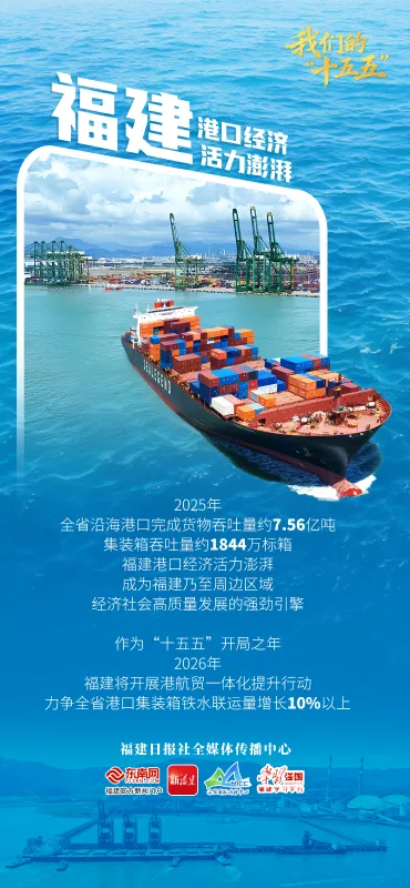 作为“十五五”开局之年,2026年全省交通运输工作会议也为福建省港航发展列出了新目标:立足21世纪海上丝绸之路核心区定位,福建省今年将开展港航贸一体化提升行动。通过实施“港口铁路通”工程,强化港口与铁路干支线衔接,做大做优海铁联运,深化“一单制”“一箱制”试点,力争全省港口集装箱铁水联运量增长10%以上,推动物流总费用占GDP比重降至13.2%。同时,加快“丝路海运”高质量发展,推动出台新一轮省级扶持政策。全年将力争实现公路、水路运输总周转量分别增长2.5%、3%,沿海港口货物吞吐量、集装箱吞吐量达7.6亿吨、1850万标箱。