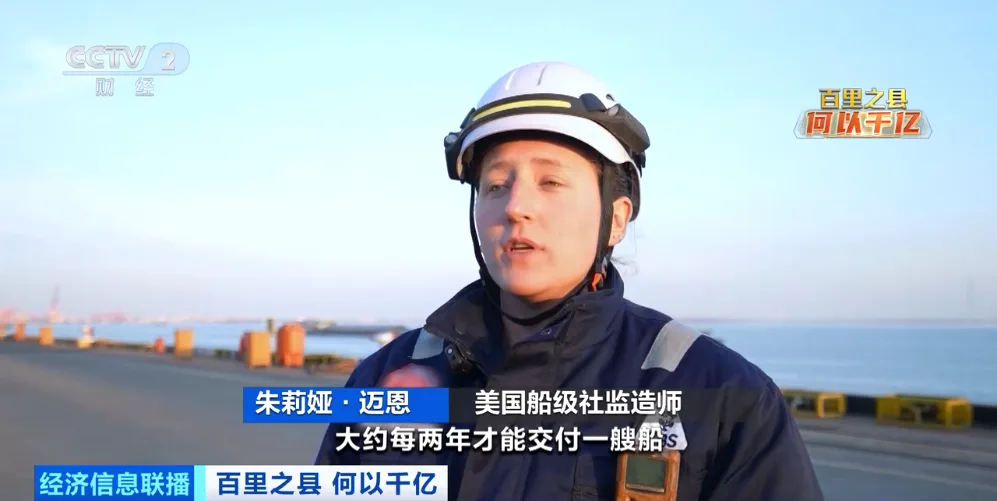 美国船级社监造师 朱莉娅·迈恩:在美国,一家造船厂大约每两年才能交付一艘船;而这家船舶公司,每年能交付30余艘船,新干船坞投用后,年交付量预计可达约45艘。