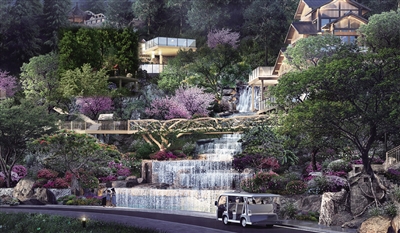 其中,一壑定势是将原生瀑布冲沟作为地块纵向中轴线,同步联通水网路径,展现巴山渝水的折叠编织。三级共生是依托展园内多级山地平台,从高到低依次构建崖顶观云、半山栖野、江岸潮涌的三级生态聚落。九境连环则综合利用上述平台空间,开发阶巷叠彩、岩径寻迹、江峡画卷、云轨廊桥、崖顶云台、雾都幻境、叠瀑流泉、崖畔重逢、樟雾迷踪等九个节点系统、植入多类运营场景。