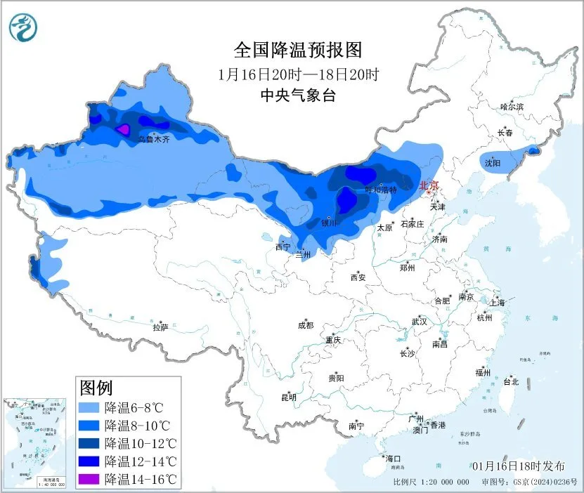 预计,1月16日20时至18日20时,新疆、甘肃、内蒙古中西部、宁夏、陕西北部、华北北部等地气温下降6~10℃,其中,新疆伊犁河谷及沿天山一带地区、内蒙古中部等地局地降温可达10~14℃。