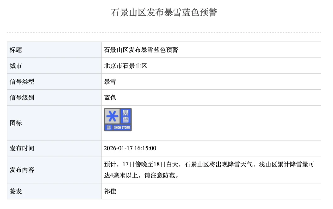 1月17日16时15分,北京市石景山区发布暴雪蓝色预警:预计,17日傍晚至18日白天,石景山区将出现降雪天气,浅山区累计降雪量可达4毫米以上,请注意防范。