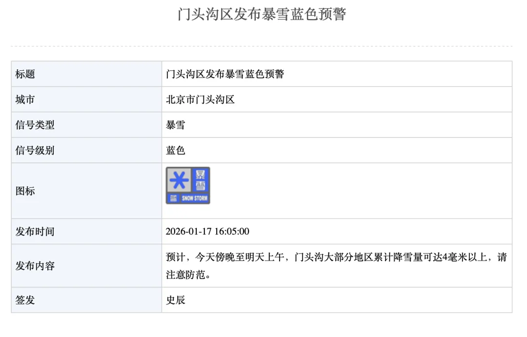 1月17日,北京石景山、门头沟、昌平、丰台、房山等五区发布暴雪蓝色预警。
