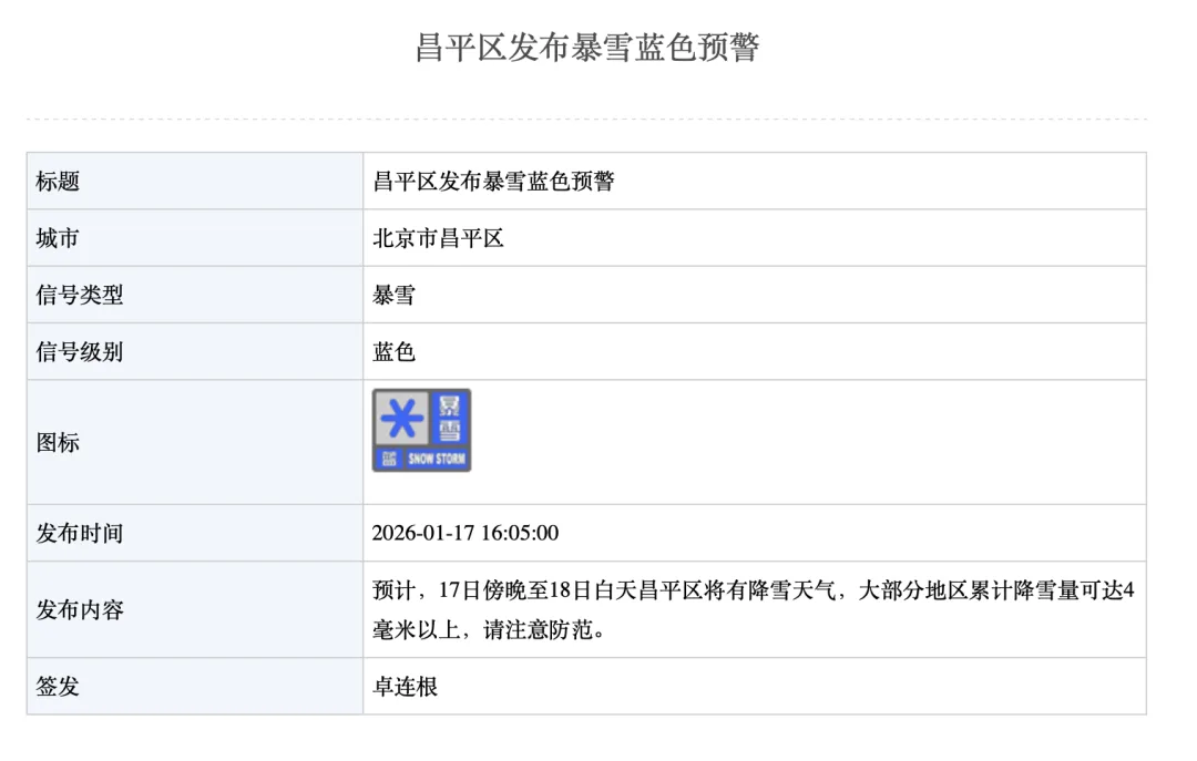 1月17日16时05分,北京市昌平区发布暴雪蓝色预警,预计,17日傍晚至18日白天昌平区将有降雪天气,大部分地区累计降雪量可达4毫米以上,请注意防范。