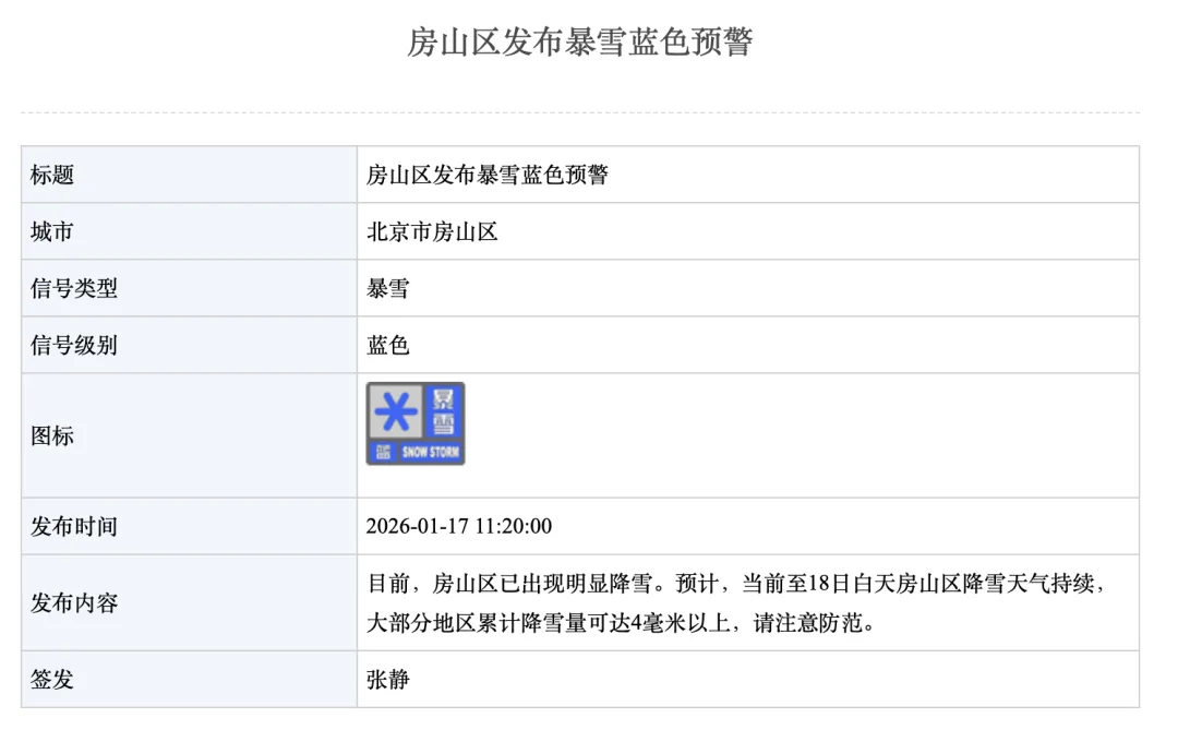 1月17日中午,北京市房山区发布暴雪蓝色预警:预计当前至18日白天房山区降雪天气持续,大部分地区累计降雪量可达4毫米以上,请注意防范。