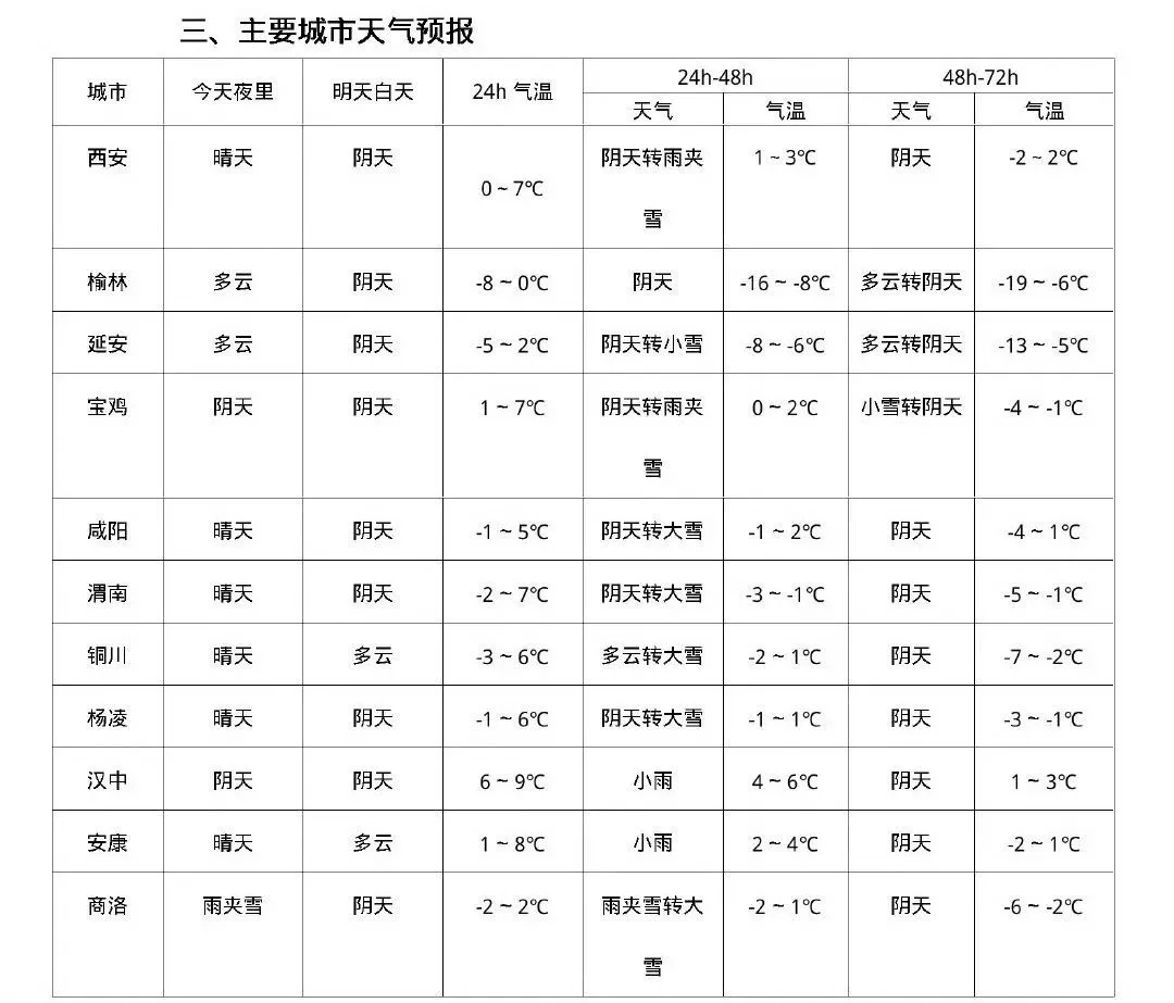 19日:雨夹雪转中雪,南部山区大雪,长安、蓝田局地暴雪,高海拔山区局地有冻雨,-5℃~2℃;