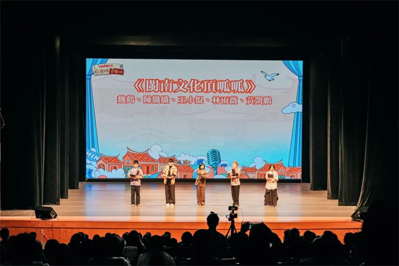 活动在亲切的闽南乡音中拉开帷幕。主持人魏鹤以一句地道的闽南话问候,瞬间拉近了与观众的距离。演出围绕闽南日常生活、人情风貌展开,从“喝汤要配话”的生活智慧,到“亏钱也要交朋友”的豪爽性情,再到“欢喜就好”的豁达哲学,演员们用轻松幽默的脱口秀,挖掘闽南文化中的可爱细节,引发阵阵会心笑声与深切共鸣。