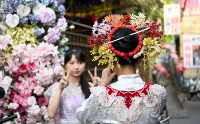 体验“簪花围”的游客在拍照留念。新华社记者 林善传 肖潇 摄