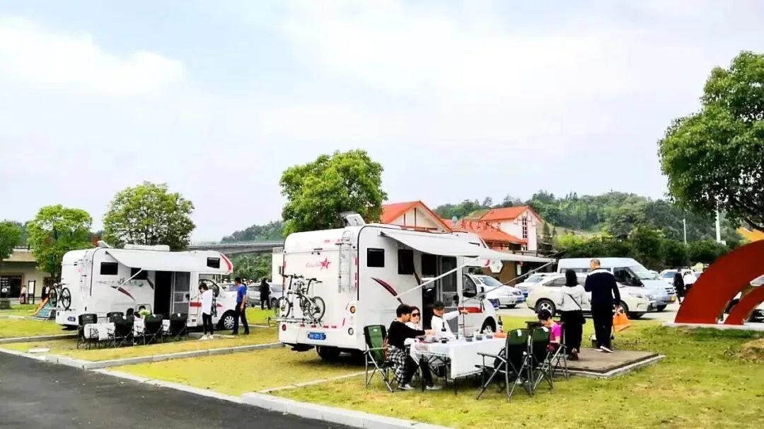 露营区东侧紧邻的大公园,更是将“舒适感”拉满。步道蜿蜒、水池清澈、廊桥雅致,绿植环绕间满是生机;向北延伸至服务区主楼的区域,还设有茶室、儿童游乐园、户外烧烤炉等,满足不同游客的需求。夜幕降临时,丹桂飘香中,驴友们搭起帐篷、点亮露营灯:有人组队野炊烧烤,烟火气十足;有家庭围坐做饭,温馨惬意。