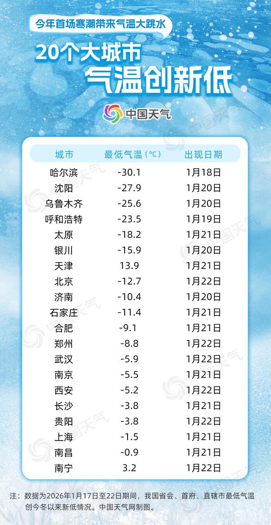 南北气温陆续触底 二十个大城市气温创新低