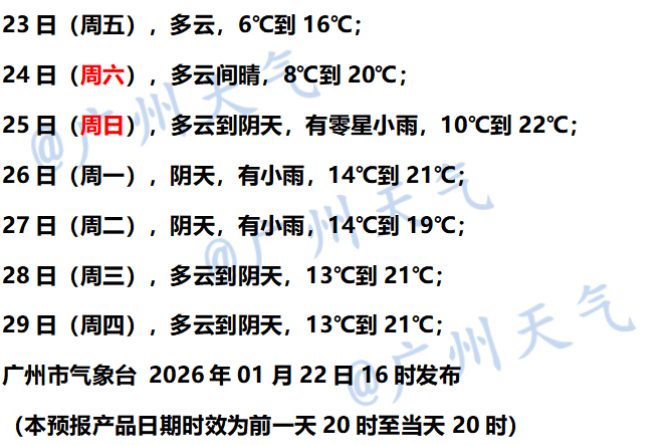 广州市气象台预计,1月23日—24日广州云量减少,渐转多云间晴天气,气温缓慢回升,早晚仍寒冷。这一波阳光值得珍惜,1月25日—27日先后受东南气流上岸、高空槽和弱冷空气渗透影响,广州云量再次增多,并伴有小雨天气,气温小幅波动。