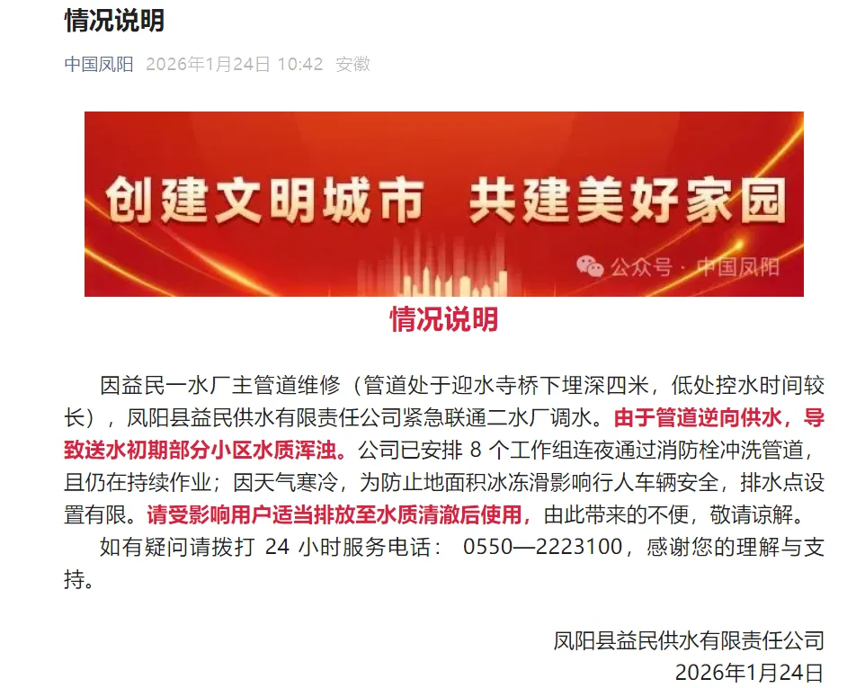 因益民一水厂主管道维修(管道处于迎水寺桥下埋深四米,低处控水时间较长),凤阳县益民供水有限责任公司紧急联通二水厂调水。由于管道逆向供水,导致送水初期部分小区水质浑浊。公司已安排 8 个工作组连夜通过消防栓冲洗管道,且仍在持续作业;因天气寒冷,为防止地面积冰冻滑影响行人车辆安全,排水点设置有限。请受影响用户适当排放至水质清澈后使用,由此带来的不便,敬请谅解。