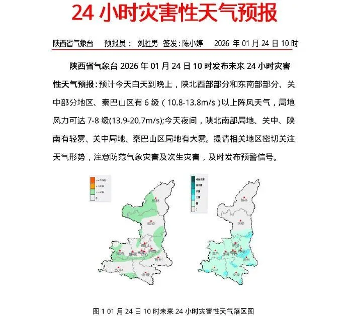 预计今天白天到晚上,陕北西部部分和东南部部分、关中部分地区、秦巴山区有6级(10.8-13.8m/s)以上阵风天气,局地风力可达7-8级(13.9-20.7m/s);今天夜间,陕北南部局地、关中、陕南有轻雾、关中局地、秦巴山区局地有大雾。提请相关地区密切关注天气形势,注意防范气象灾害及次生灾害,及时发布预警信号。
