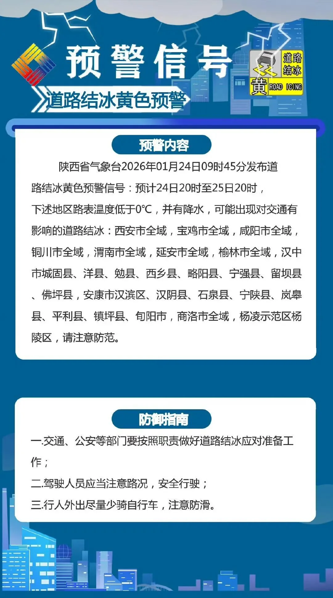 预计24日20时至25日20时,下述地区路表温度低于0℃,并有降水,可能出现对交通有影响的道路结冰:西安市全域,宝鸡市全域,咸阳市全域,铜川市全域,渭南市全域,延安市全域,榆林市全域,汉中市城固县、洋县、勉县、西乡县、略阳县、宁强县、留坝县、佛坪县,安康市汉滨区、汉阴县、石泉县、宁陕县、岚皋县、平利县、镇坪县、旬阳市,商洛市全域,杨凌示范区杨陵区,请注意防范。