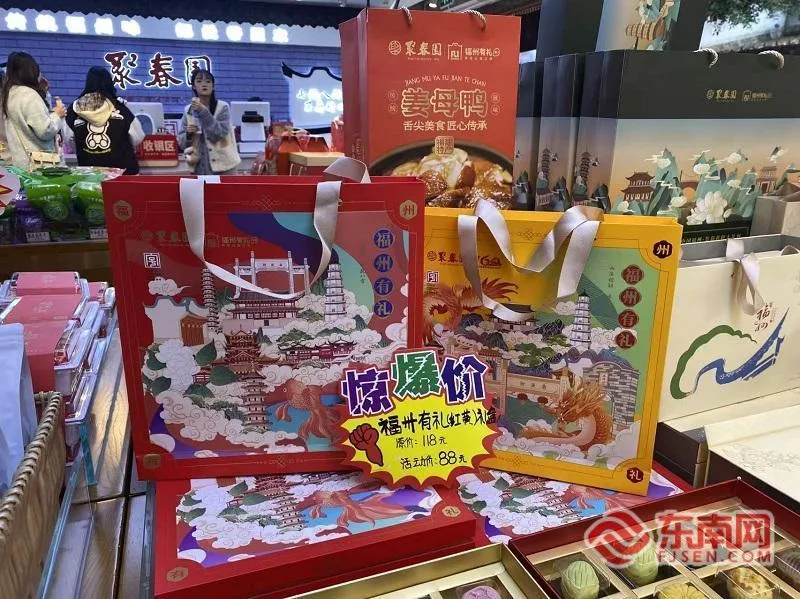 福州作为“有福之州”,年货市场上满是“福”字印记。在三坊七巷,由老字号聚春园集团运营的福州市公共消费品牌“福州有礼”商店内,写有“福”字的年糖年饼礼盒摆放在柜台上,喜庆氛围扑面而来。传统年糖年饼被精心装进喜庆的“福袋”中,延续着“团圆有福”的民俗寓意,成为市民游客的抢手年货。