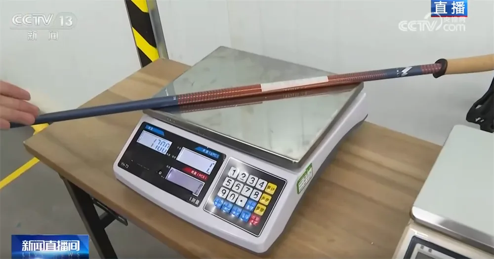拿到这根滑雪杖,给记者的第一印象是震撼,如此之轻!来给大家直观地展示一下,这是刚刚制作出来的杖身部分,也是滑雪杖的主要部件。它的重量是170g,和旁边的苹果相比还要再轻一些。这么轻的一根滑雪杖能抵抗住滑雪时的高强度冲击吗?在这里,每一款新品出厂前都要经过严格的“体检”。体检内容包括抗疲劳测试——反复敲击10万次,确保不变形;承压力测试——在小小杖体上施加500牛至800牛的压力,是国家标准的1.56至2.5倍;还有耐用测试——在潮湿、酸碱环境中反复试验等等。高标准、严要求之下“杖”量高品质。