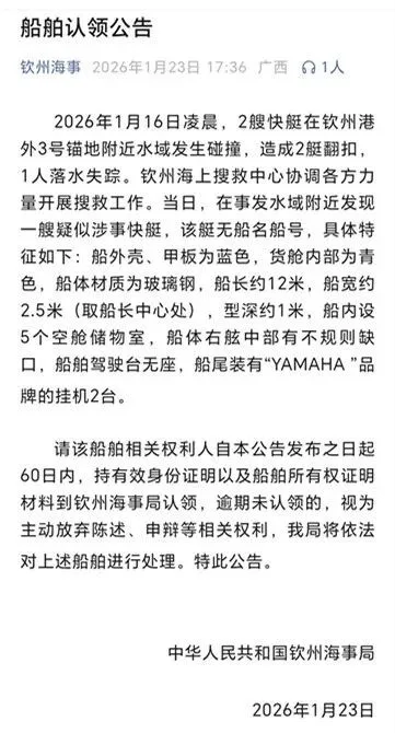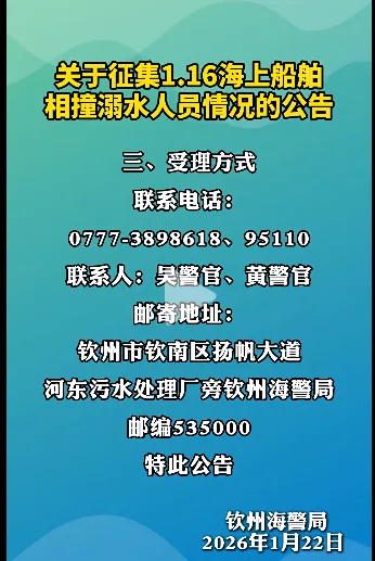 22日,钦州海警局发布了关于征集该起事故中溺水人员相关信息的公告。23日,钦州海事局也发布公告,让该船舶相关权利人60日内到钦州海事局认领,逾期未认领的,视为主动放弃陈述、申辩等相关权利。