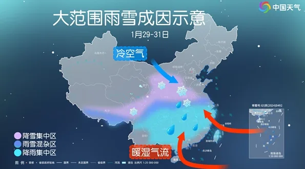预计1月29日至31日,北方大部地区自西向东有小雪,陕西中南部、山西南部、河南西部、湖北北部有中到大雪,局地高海拔山区有暴雪;南方大部多阴雨天气。