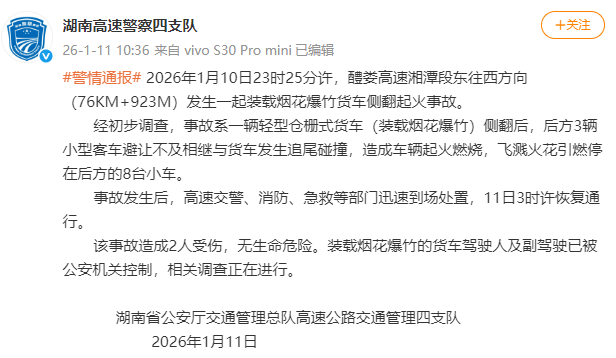 2026年1月10日23时25分许,醴娄高速湘潭段东往西方向(76KM+923M)发生一起装载烟花爆竹货车侧翻起火事故。