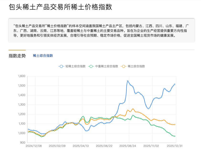 据悉,该指数于2025年12月5日在2025企业家博鳌论坛上发布以来,为建立体系健全、机制完善和功能有效的稀土价格信息提供有力工具,助力稀土市场健康有序发展,一经发布得到稀土行业广泛关注。目前,稀交所“每日成交价格、周频稀土价格指数、月频稀土价格预期指数”综合价格体系日渐完善。