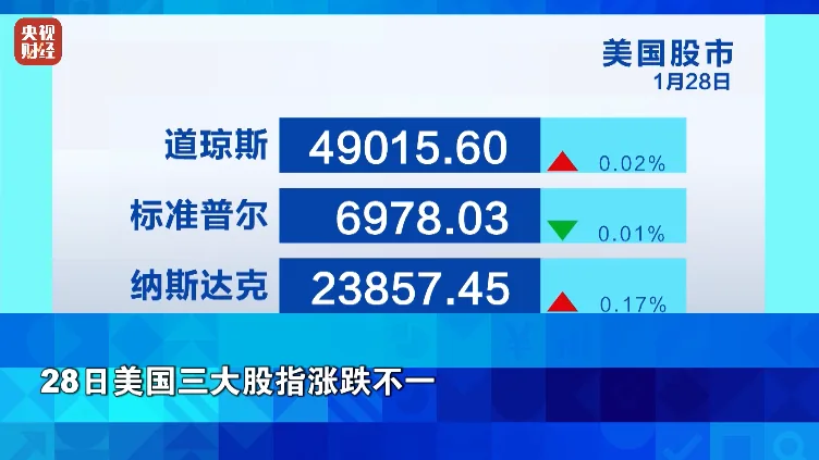 当地时间周三,美联储午盘后公布1月利率决议,微软、Meta和特斯拉三家科技巨头盘后密集发布财报,投资者谨慎交易,美国三大股指全天小幅波动。受部分AI行业公司财报利好推动,标普500指数周三一度短暂站上7000点整数关口,创盘中历史新高。午盘后,美联储宣布“按兵不动”并释放“鹰派”信号,标普500指数转跌,美国三大股指周三涨跌不一。截至收盘,道指微涨0.02%,标普500指数微跌0.01%,纳指涨0.17%。