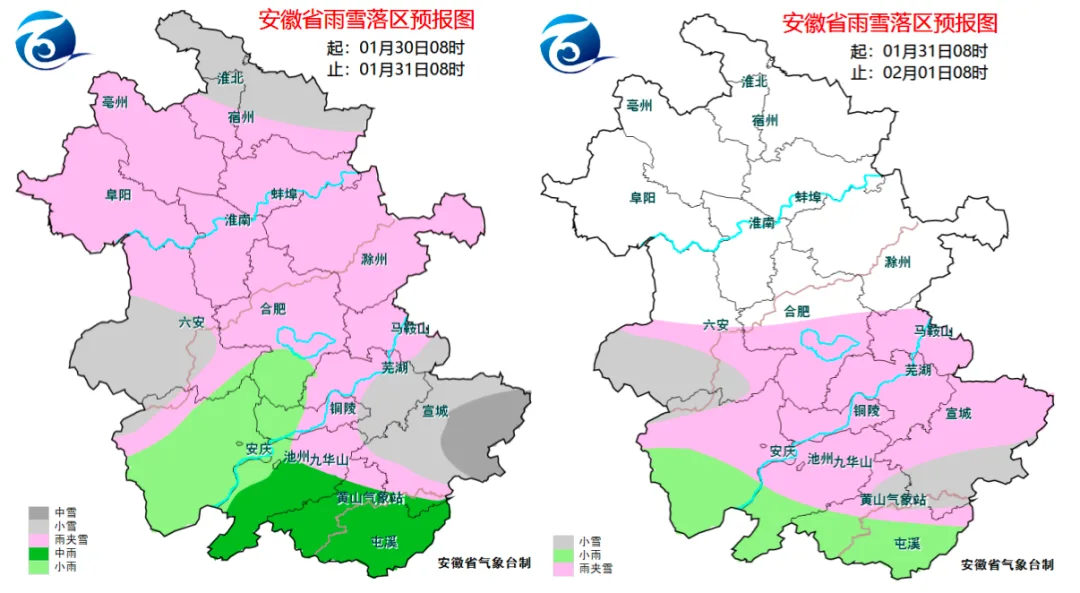 30日:全省阴天。江南南部有中雨;其他地区有小雨或雨夹雪,其中大别山区和江南部分地区有中雪,局部大雪。