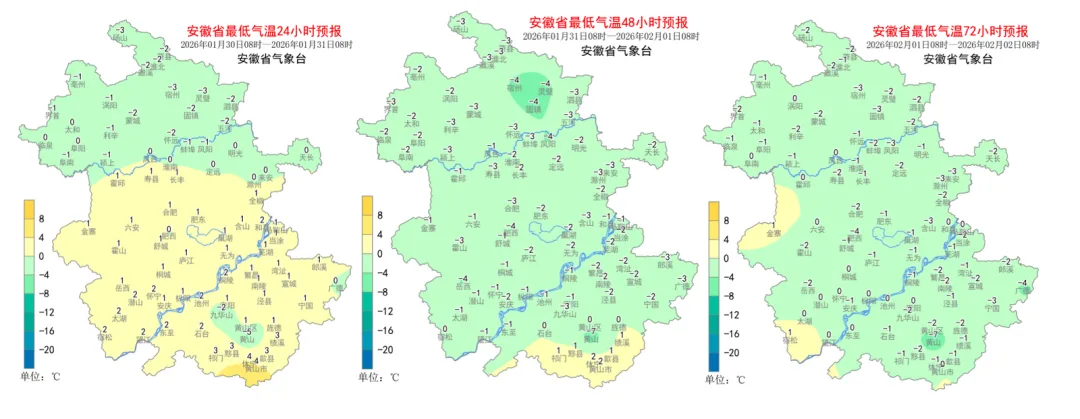 受弱冷空气影响,安徽省气象台预计,今明两天全省大部分地区平均气温将下降3~5℃,同时今天全省平均风力增大到3~4级,阵风7级。冷空气过后,2月1日早晨安徽省最低气温:淮河以北和本省山区-4~-2℃,江南南部0~2℃,其他地区-3~-1℃。