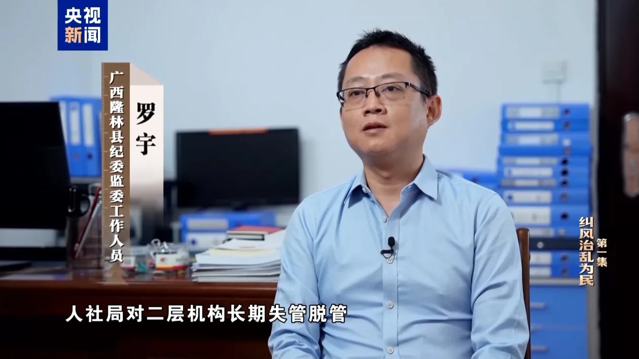 广西隆林县纪委监委工作人员 罗宇:人社局对二层机构长期失管脱管,没有专人去对业务办理资金发放这些进行监督审计,她们的权限太大了,没有人进行监管,所以就造成了这两个人在办理养老业务过程中长期脱管的状态。