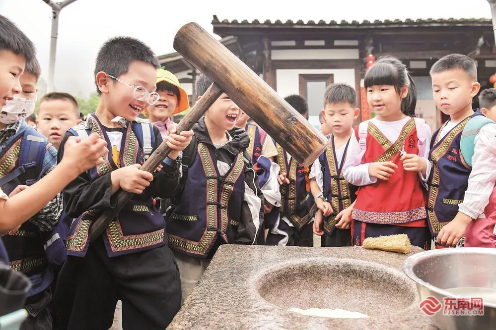 在罗源县松山镇竹朴村晚院子,孩子们在体验打畲族糍粑的乐趣。