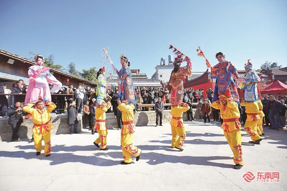 在罗源县起步镇桂林院子,游客在观看当地非遗代表性项目“肩头坪”表演。