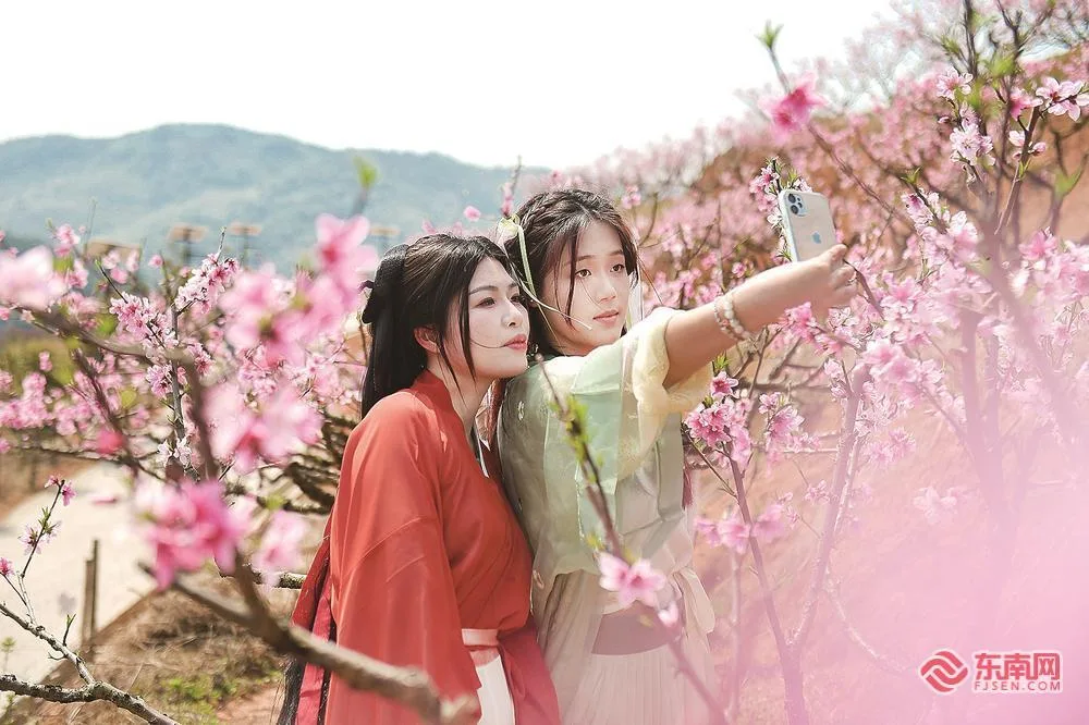 游客在罗源县中房镇下湖村桃花园里打卡拍照。