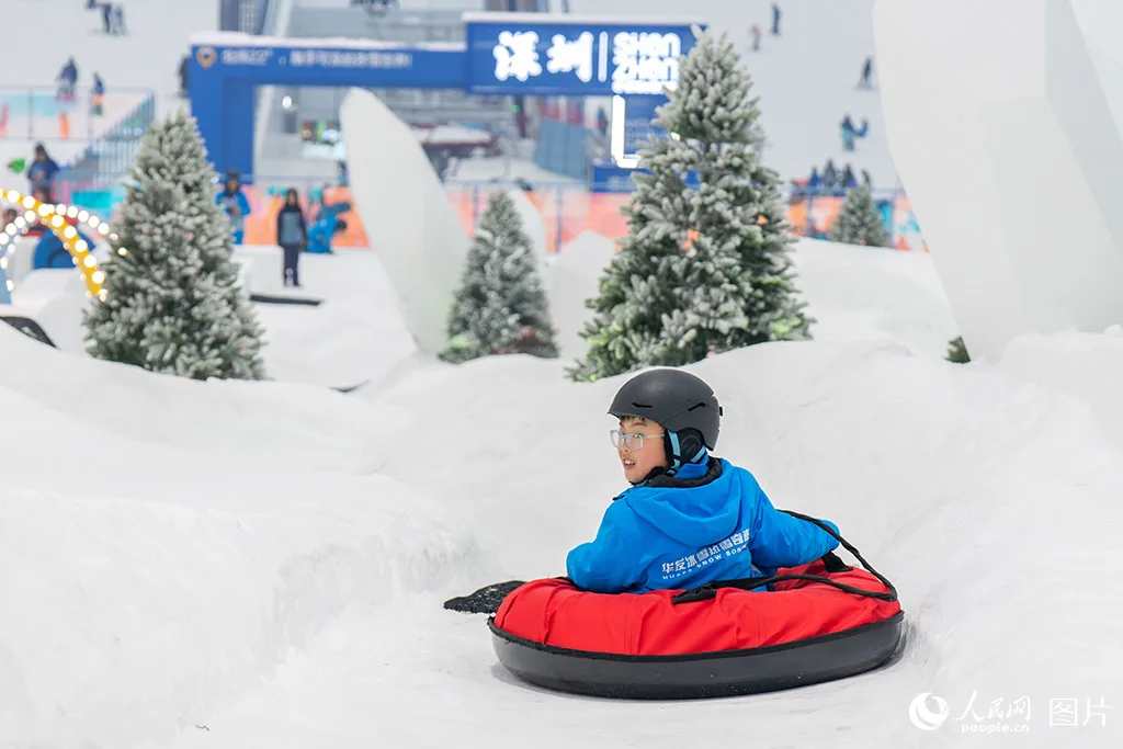 深圳前海冰雪世界内,小朋友开心的在雪上玩耍。人民网 王星摄