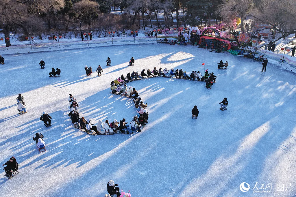 2026年1月24日,在辽宁沈阳北陵公园冰场,冰雪运动爱好者驾驶冰车组成真人版的冰上“贪吃蛇大队”,体验着与陌生人一同玩耍的趣味,在滑行中感受北方孩童冬日的快乐。人民网记者 周颂雪摄
