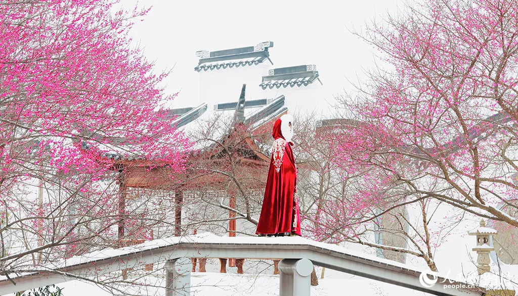 2026年1月20日,游客在湖北荆州梅园踏雪赏梅。人民网记者 王郭骥摄