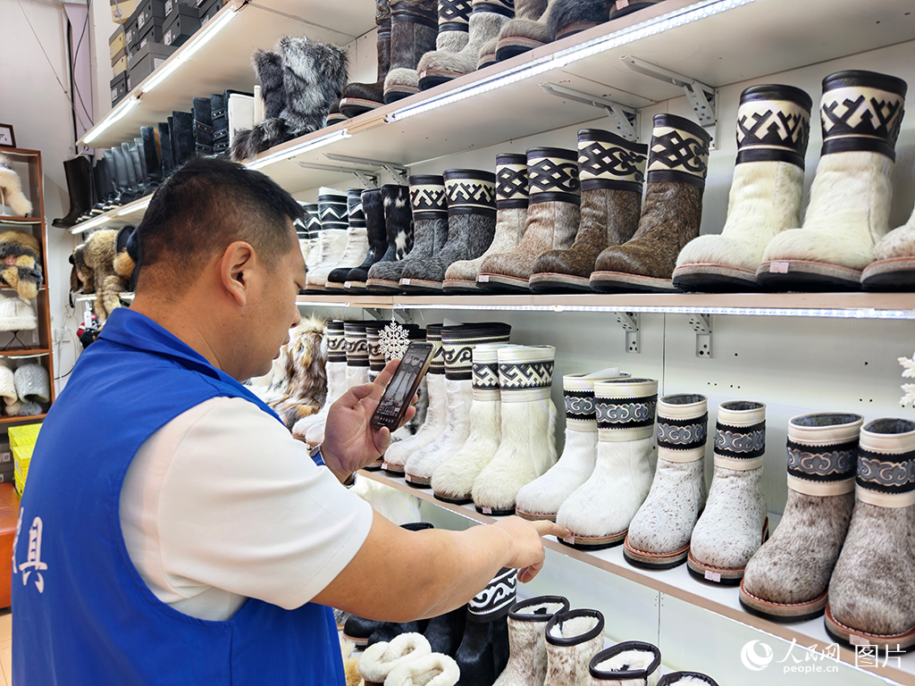 2025年12月22日,在内蒙古呼伦贝尔市的一家鞋店内,店员正在线上帮助顾客选购马毛靴。人民网记者 赵梦月摄