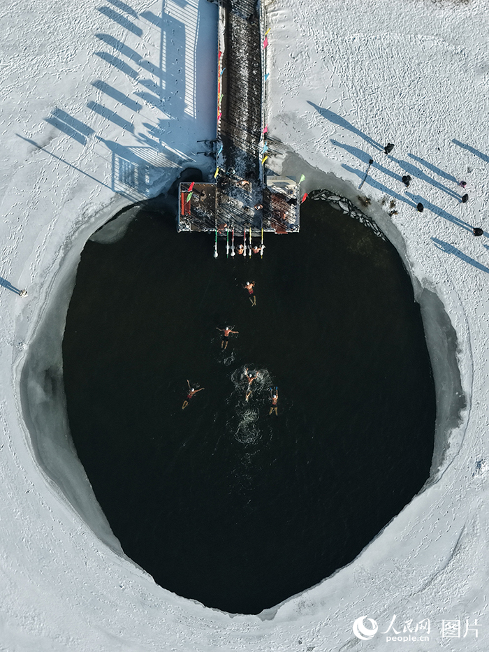 2026年1月10日,一群冬泳爱好者在吉林长春南湖公园畅游。人民网记者 李洋摄