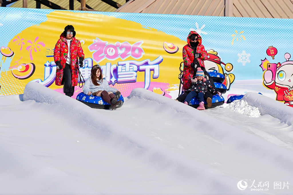 2026年1月11日,游客在天津欢乐谷雪场体验滑雪圈。人民网记者 崔新耀摄