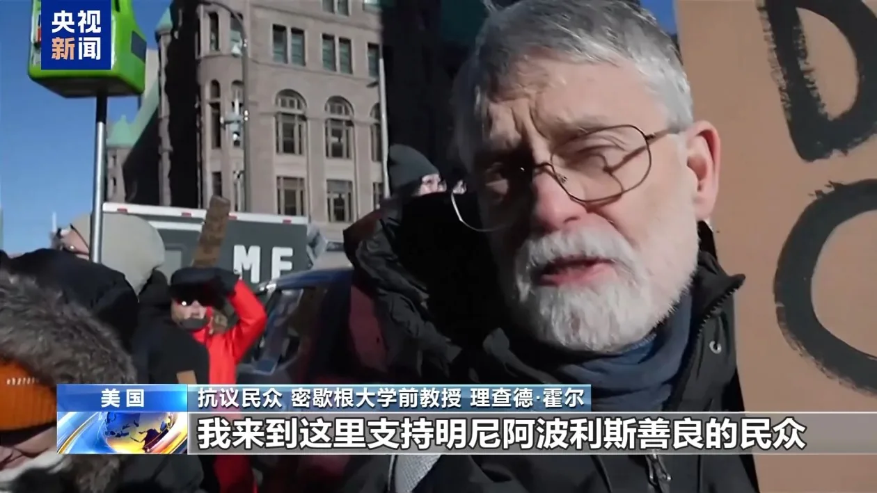 抗议民众 密歇根大学前教授 理查德·霍尔:我来到这里支持明尼阿波利斯善良的民众,他们站出来对抗日益猖獗的威权主义。我从没见过这样的场面,我研究美国政府四十年了,从来没出现过这种局面。
