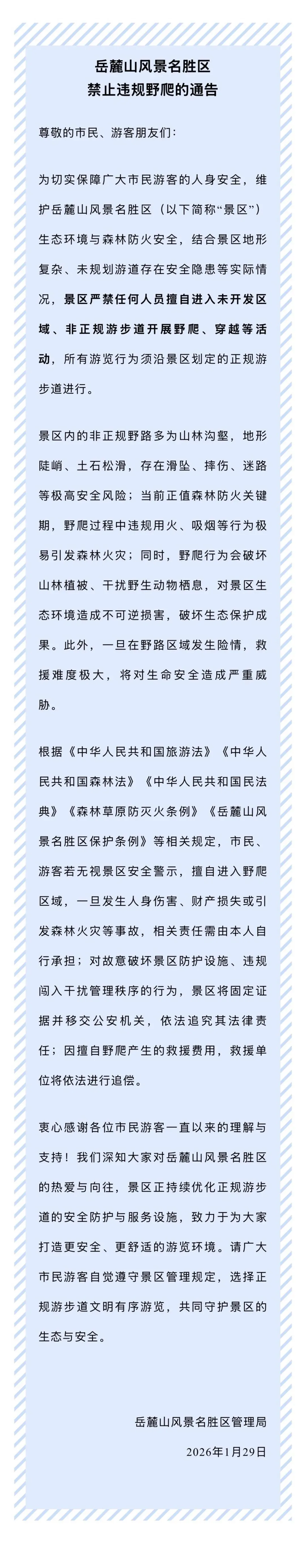 岳麓山风景名胜区管理局1月29日发布关于岳麓山风景名胜区禁止违规野爬的通告:为切实保障广大市民游客的人身安全,维护岳麓山风景名胜区(以下简称“景区”)生态环境与森林防火安全,结合景区地形复杂、未规划游道存在安全隐患等实际情况,景区严禁任何人员擅自进入未开发区域、非正规游步道开展野爬、穿越等活动,所有游览行为须沿景区划定的正规游步道进行。