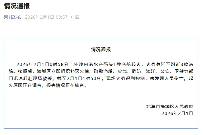 2026年2月1日0时58分,外沙内港水产码头1艘渔船起火,火势蔓延至附近3艘渔船。接报后,海城区立即组织扑灭火情、疏散渔船。应急、消防、海洋、公安、卫健等部门迅速赶赴现场救援。截至2月1日1时50分,现场火势得到控制,未发现人员伤亡。起火原因正在调查,损失情况正在核查。