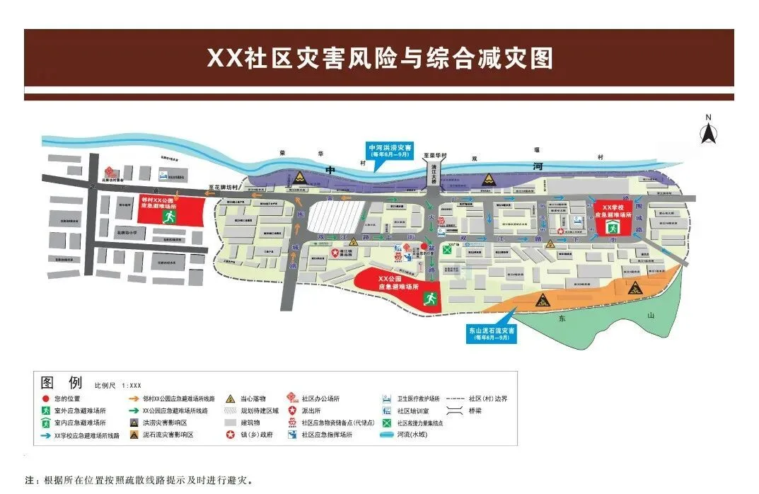 社区灾害风险与综合减灾图:综合展示社区内灾害风险种类及隐患点位置或区域、社区综合减灾场所位置、疏散线路等信息;