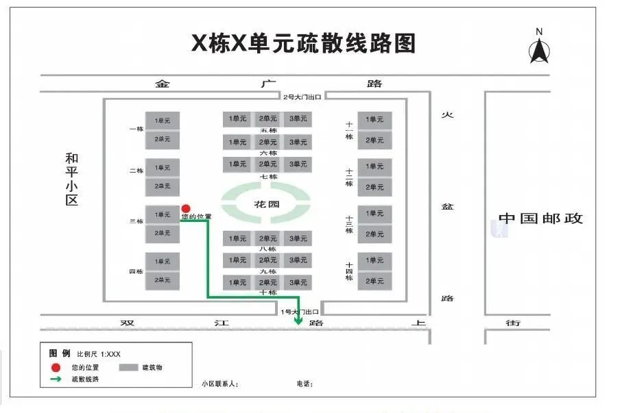 疏散线路图:标明当前区域内向应急避难场所疏散的方向和线路,包括住宅小区(院落)疏散线路图、单元疏散线路图和散居住户疏散线路图。