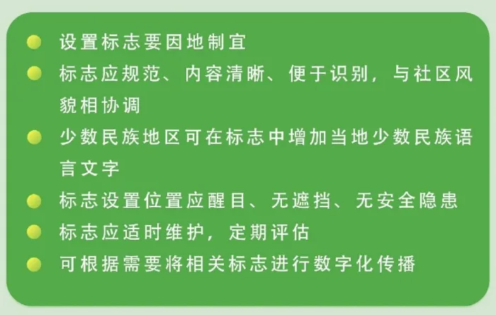 标志在使用时,除了有图形,还会配合相应文字,说明标志的内容。此外,少数民族地区可视情况在标志中增加当地少数民族语言文字,确保居民能看懂。