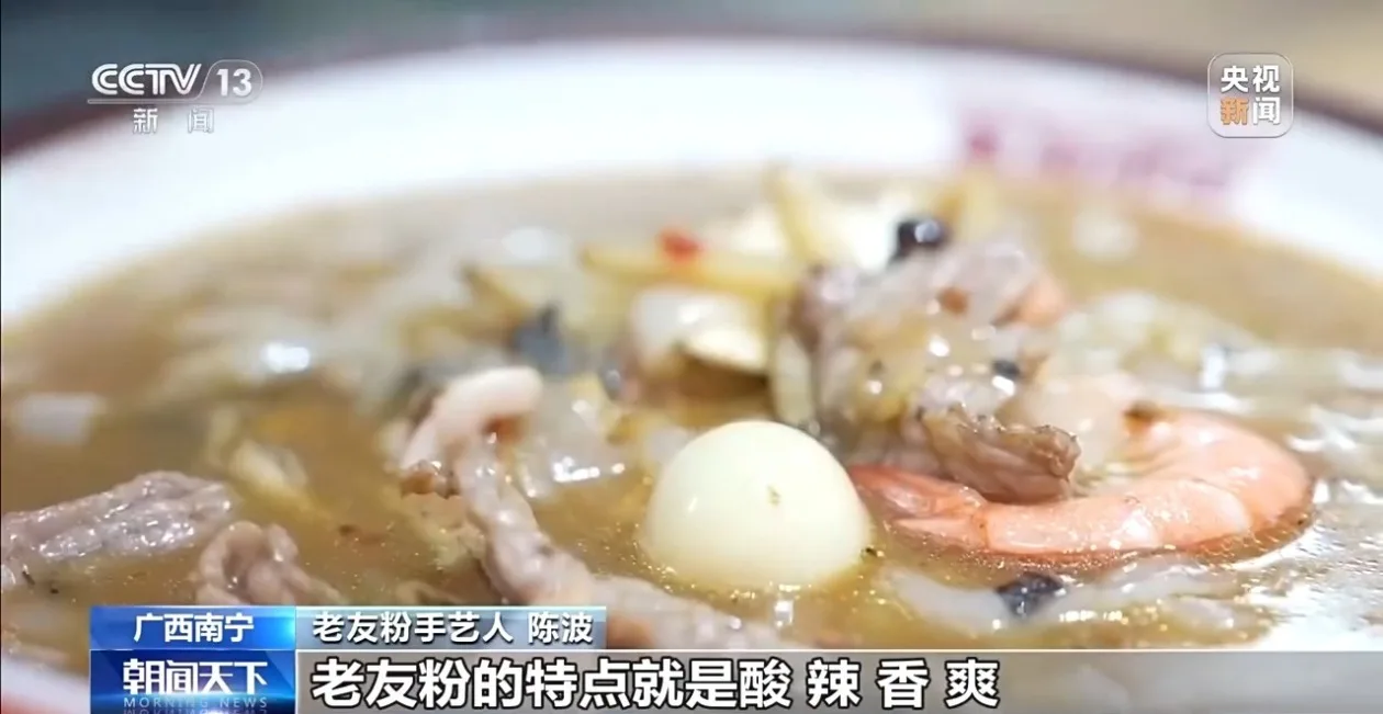 总台记者 陈小鹏:这样一碗镬气满满的老友粉就煮好了。非常浓郁的老友的味道,酸辣鲜香!尝一口这个粉,非常爽滑。这个粉为什么叫老友粉呢?这里面有一个非常暖心的故事。从前,有一位老翁经常光顾一家茶馆。因为老翁感冒,有几天他就没有去这家茶馆,茶馆的老板就非常地担心。他便试着将这个面条儿,配以爆香的蒜末、酸笋、辣椒和这个豆豉,煮了一碗面,然后赠给这个老翁吃。老翁吃了这么一碗酸辣鲜香的面,顿时之间出了一身热汗,感冒也好了大半。事后,老翁就提着一块写有“老友常临”的牌匾,赠给了这个茶馆老板,并说这块牌匾就代表着二人的友谊。从此之后,老友面就因此而诞生了。那因为广西人更喜欢吃米粉,慢慢地这个老友粉才发展下来。