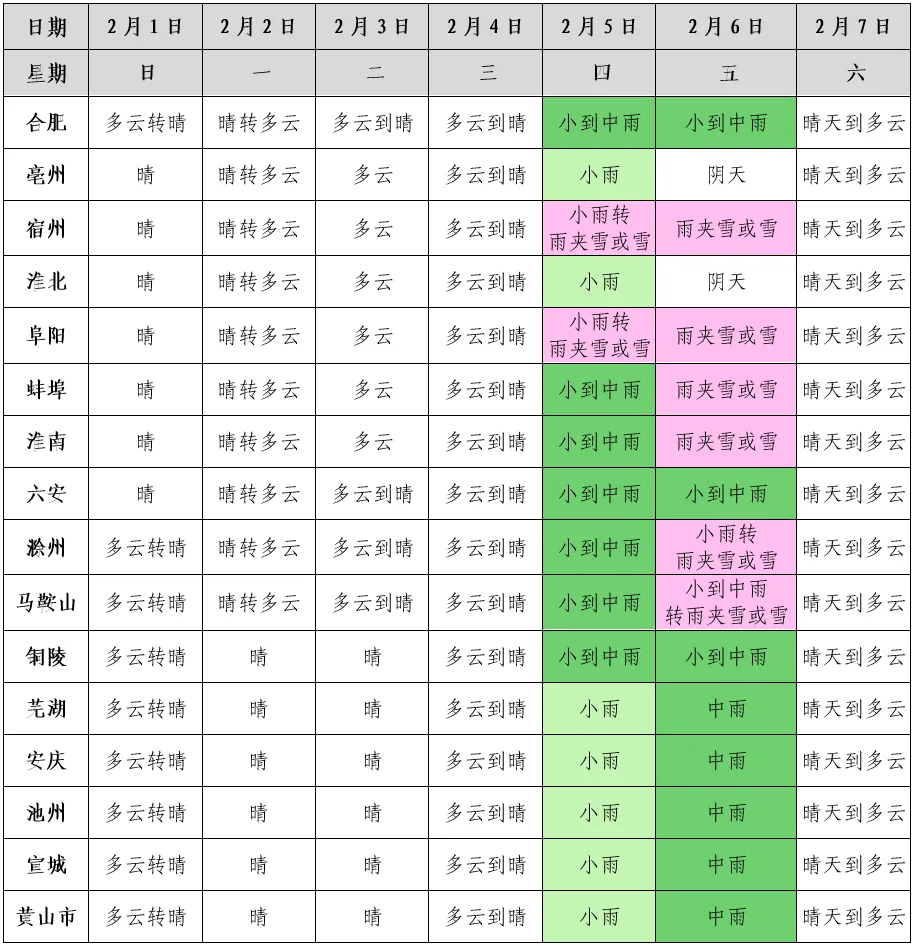6日:全省阴天。沿淮淮河以南有小雨,江淮之间部分地区和江南有中雨,其中沿淮至沿江部分地区有雨夹雪或雪。