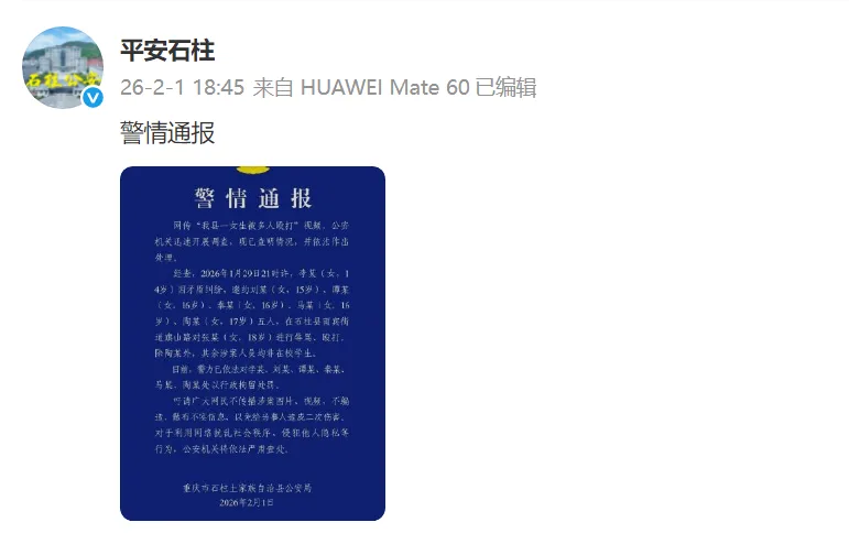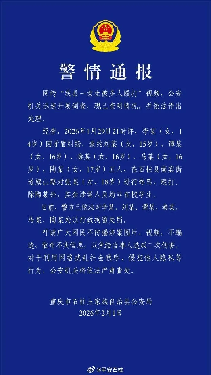 您的位置 > 首页 > 国内 重庆石柱警方通报“一女生被多人殴打”:已行拘六人 来源:平安石柱 | 日期:2026-02-01 | 阅读:13 重庆石柱土家族自治县公安局官方微博发布警情通报: 标签: 暂无标签 上一篇 记者观察丨伊朗正保持警惕 做好应对任何情况准备 下一篇 演员宋佳,任黑龙江省政协委员 ❤️ 赞一个 (0) 🔗 分享