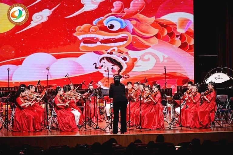 第二篇章弦音如丝绘音画。仓一小逐梦弦乐团在徐玲老师指挥下,以丝绒般音色演绎《第二圆舞曲》《新春乐》《弦乐小夜曲》等多首经典。旋律在优雅浪漫与欢快热烈间流转,将古典雅韵与新春喜庆完美融合,带领观众沉浸式徜徉于诗意旋律之中。