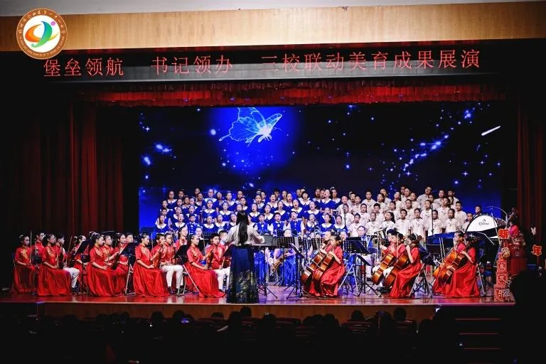 第四篇章管弦和鸣奏强音。逐梦管乐团与弦乐团携手呈现悠扬合奏,通过坚定旋律、辽阔意境与奔放节奏的层层递进,将现场气氛推向顶峰。压轴环节,仓一小逐梦合唱团与观澜小学合唱团联袂献唱《如愿》,用歌声致敬先辈;艺术顾问康宇丹老师登台指挥,全场齐唱《歌唱祖国》,家国情怀与艺术之美在礼堂久久回荡。