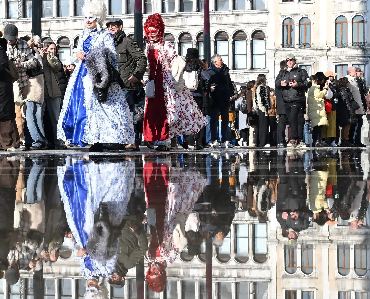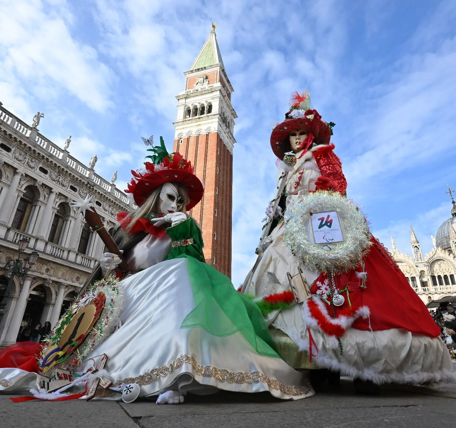 1月31日,在意大利威尼斯,穿着2026年米兰-科尔蒂纳冬奥会主题装扮的狂欢节参与者在圣马可广场摆造型。